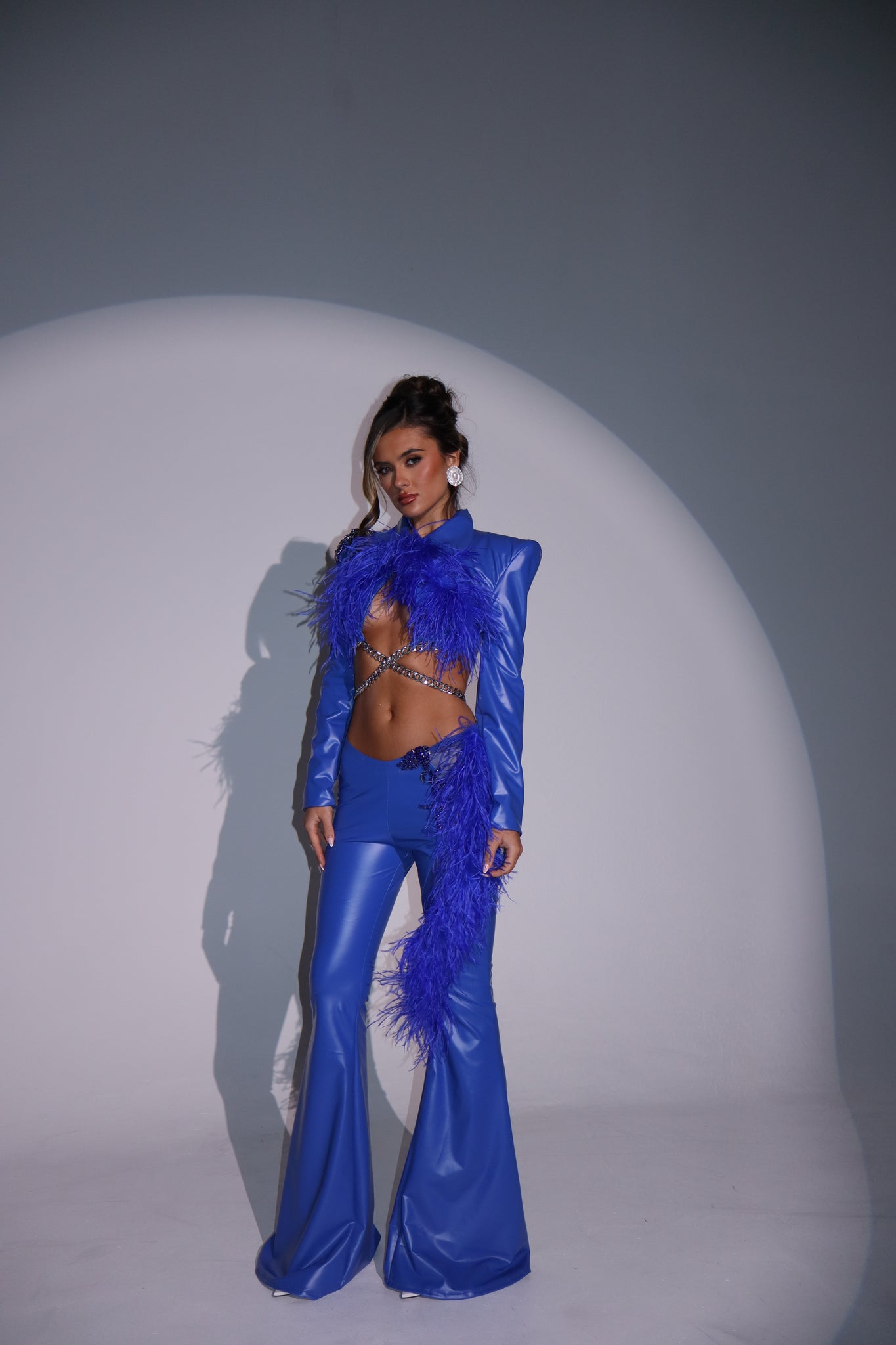 The VIOLET Cropped Jacket and Faux Leather Trousers with Feathers and Diamond Embellishments (Electric Blue)