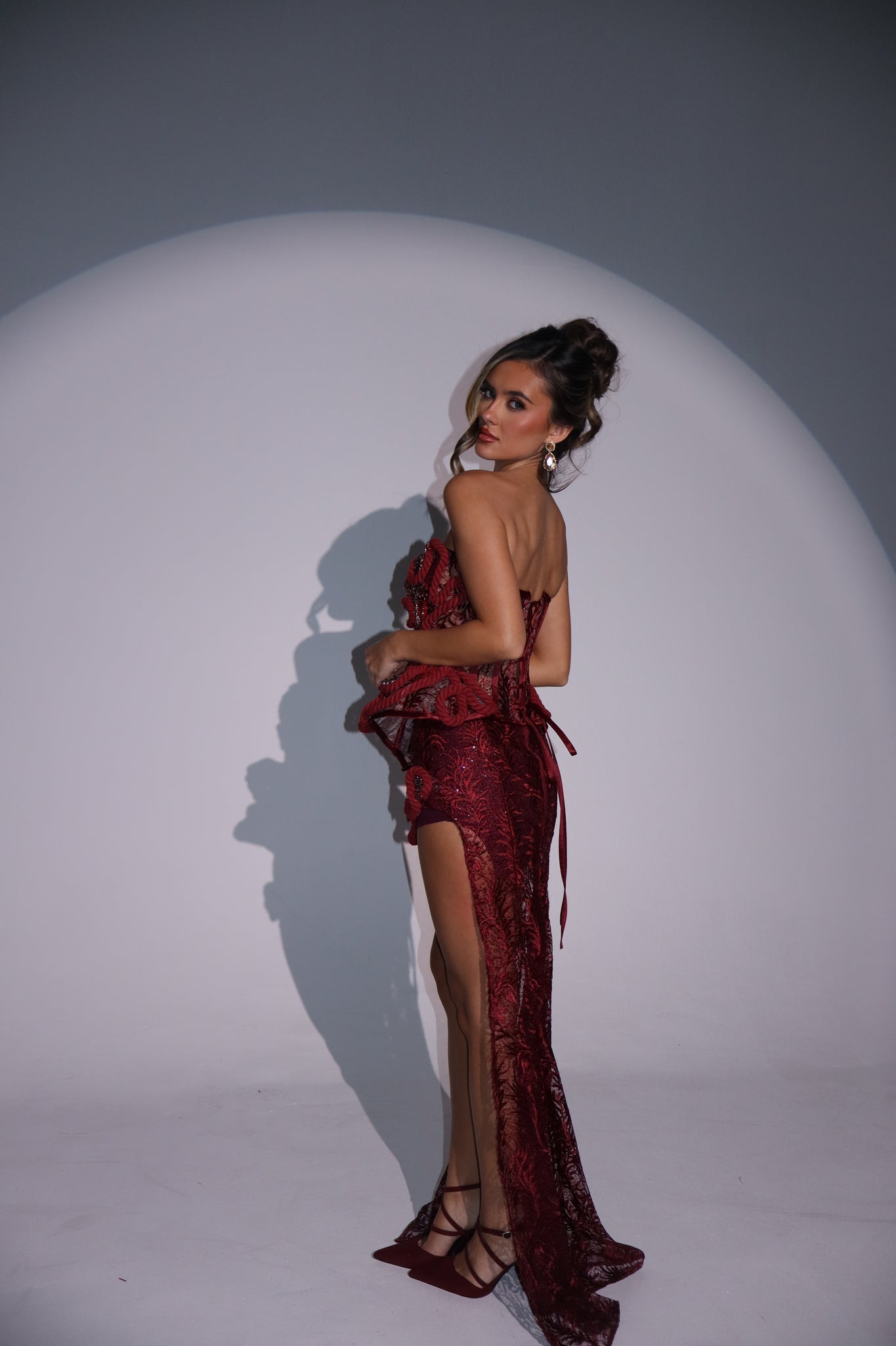 The RAVINA Basque and Maxi Skirt with Rope and Diamond appliqués (Burgundy)