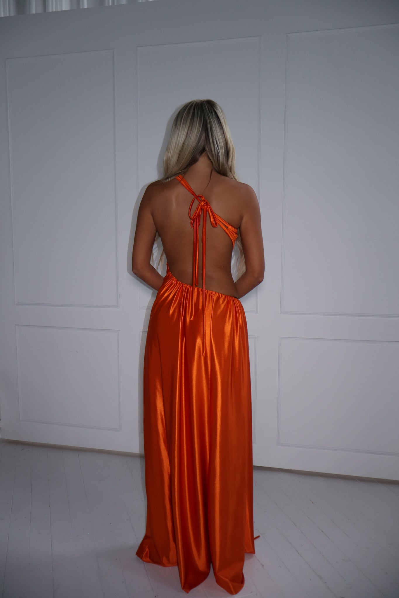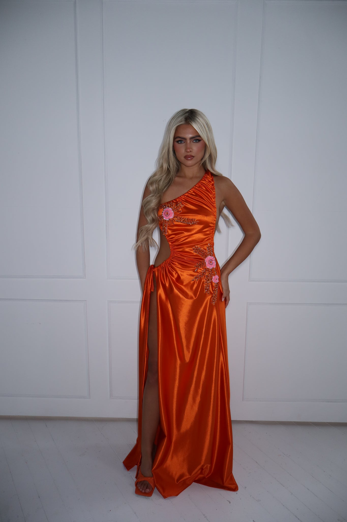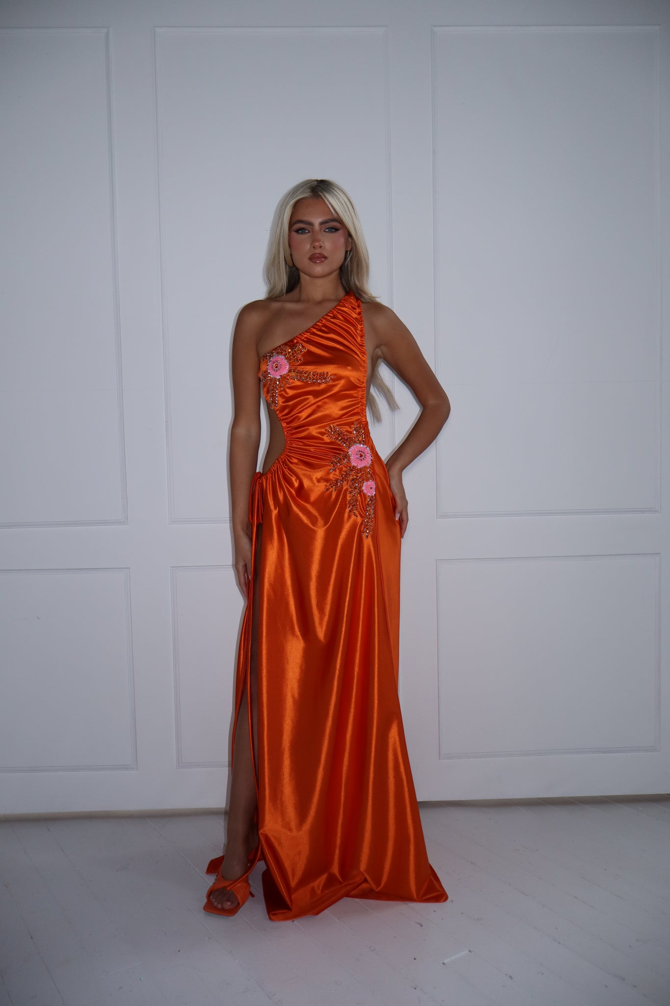 The GLOWYN Stretch Satin Maxi Dress with Floral Diamonte Embellishments (Orange)