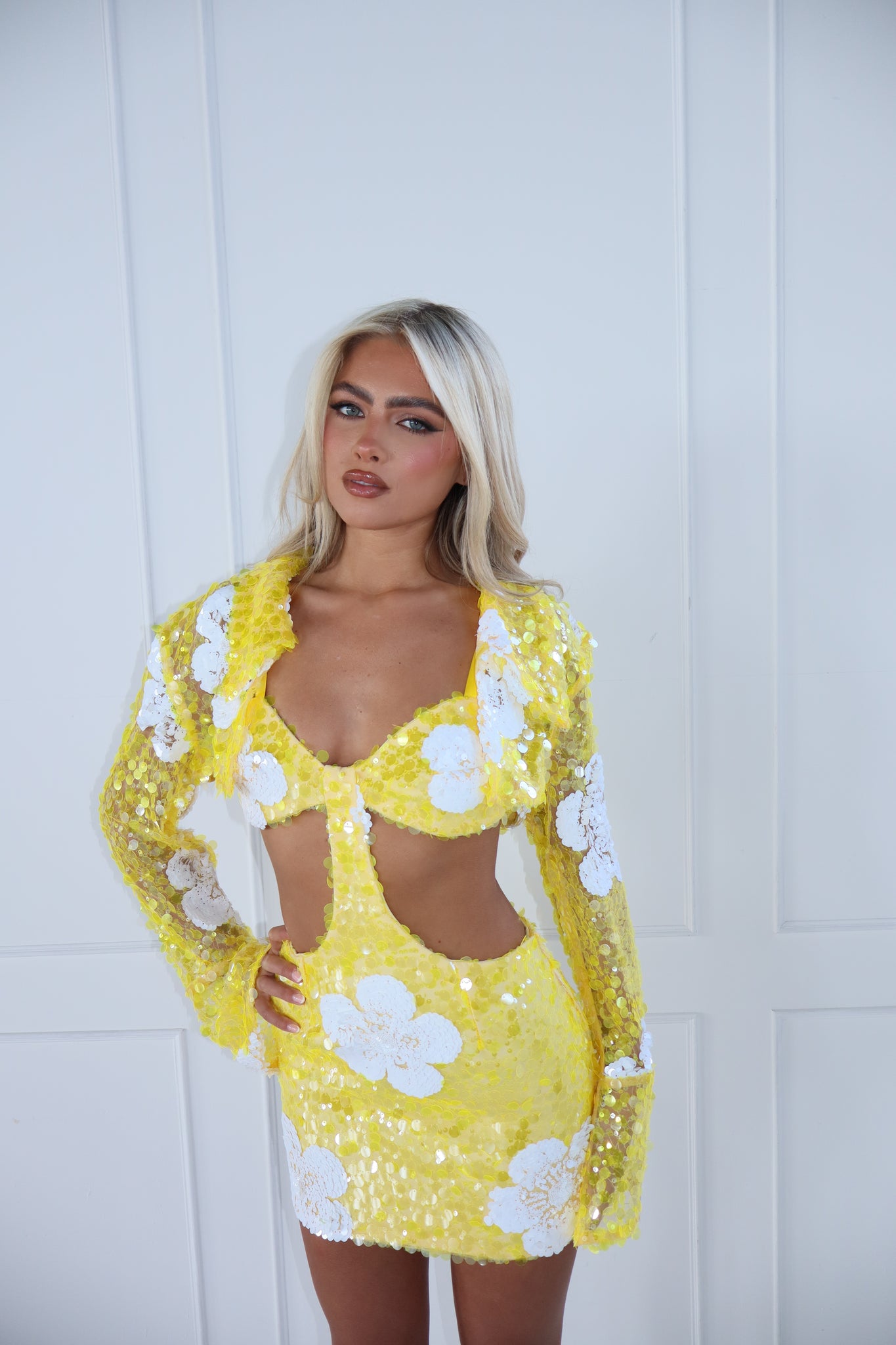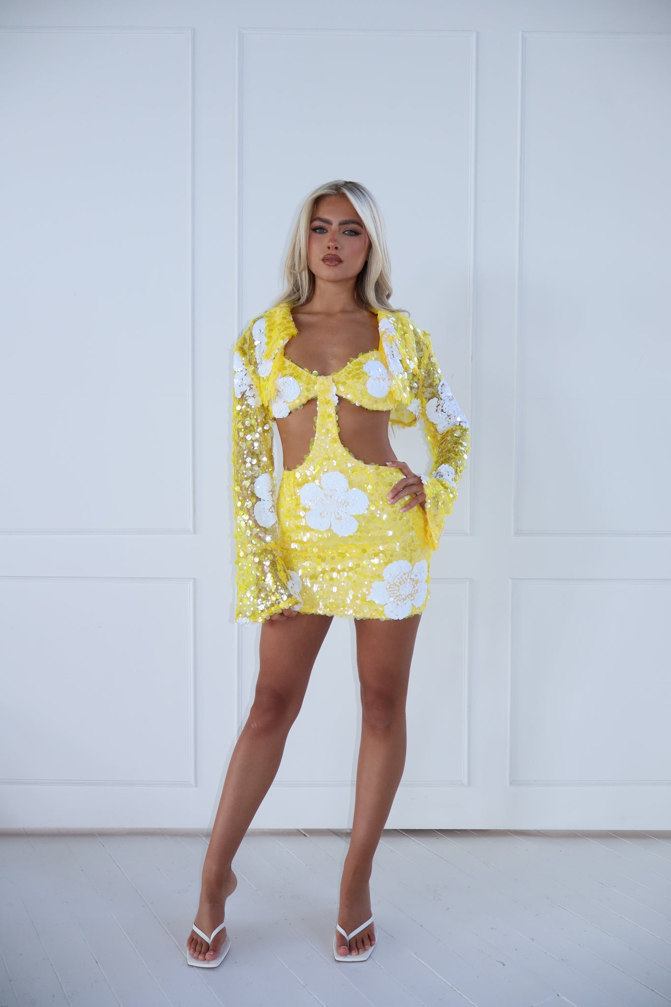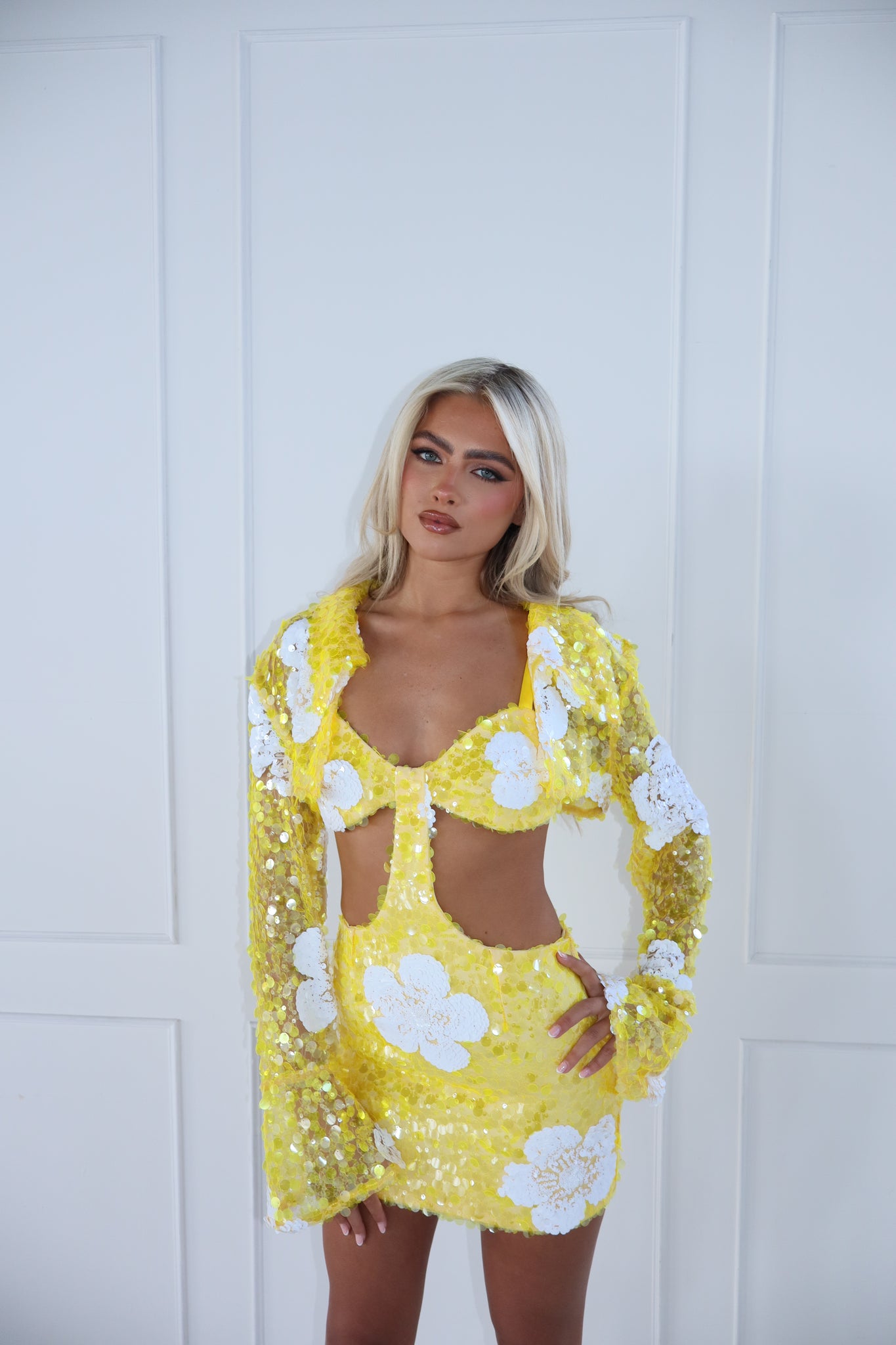 The ROSELIGHT Dress and Cropped Jacket - Yellow/White Flower Sequin